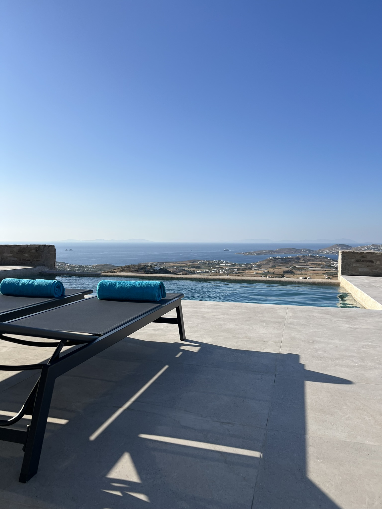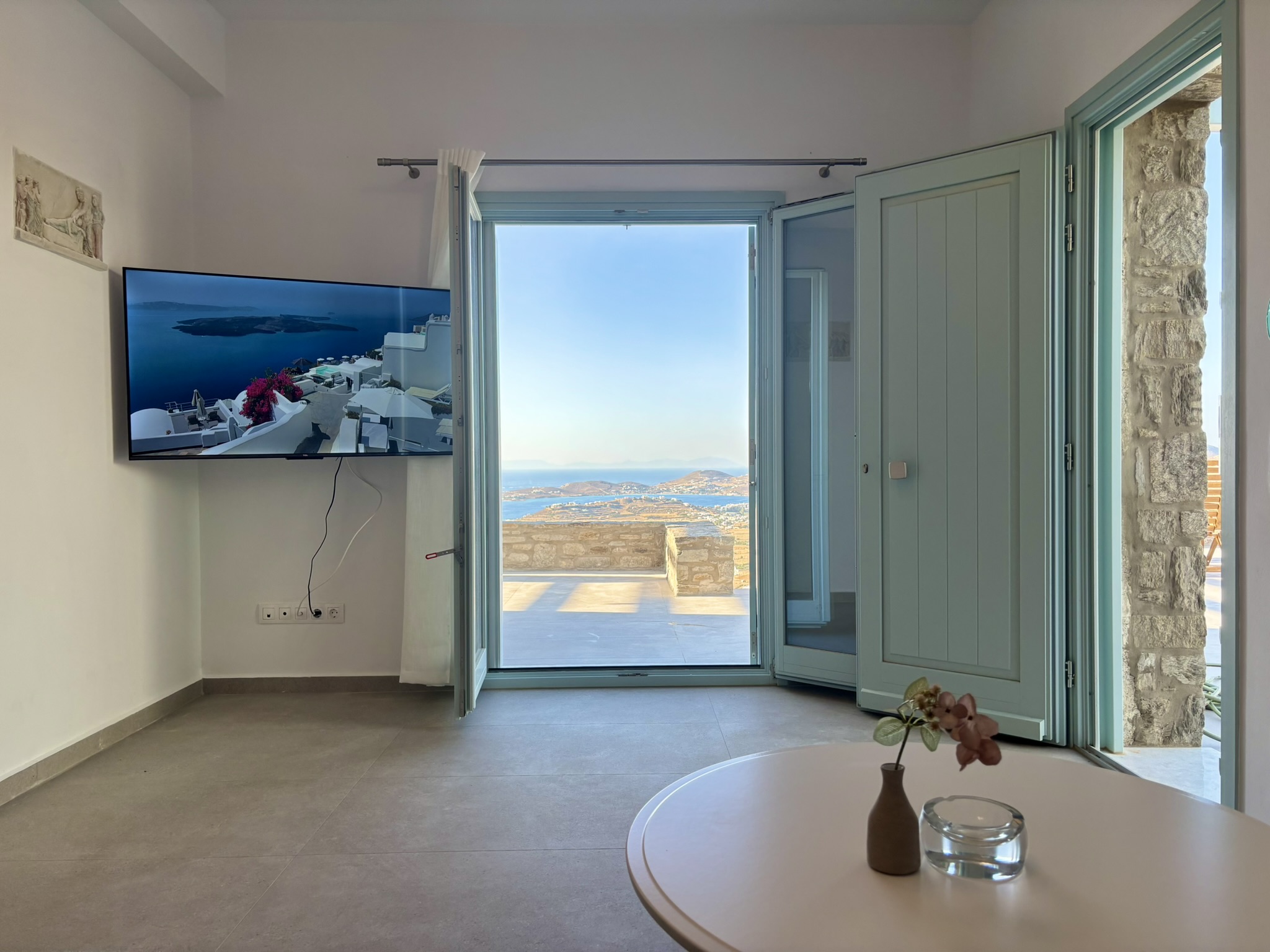 Theasis sits above the bay rather than in the middle of it, so the stay feels more secluded without becoming inconvenient. Guests get the open panorama, the stone-and-light Cycladic atmosphere, and quick access back to Parikia when they want it.